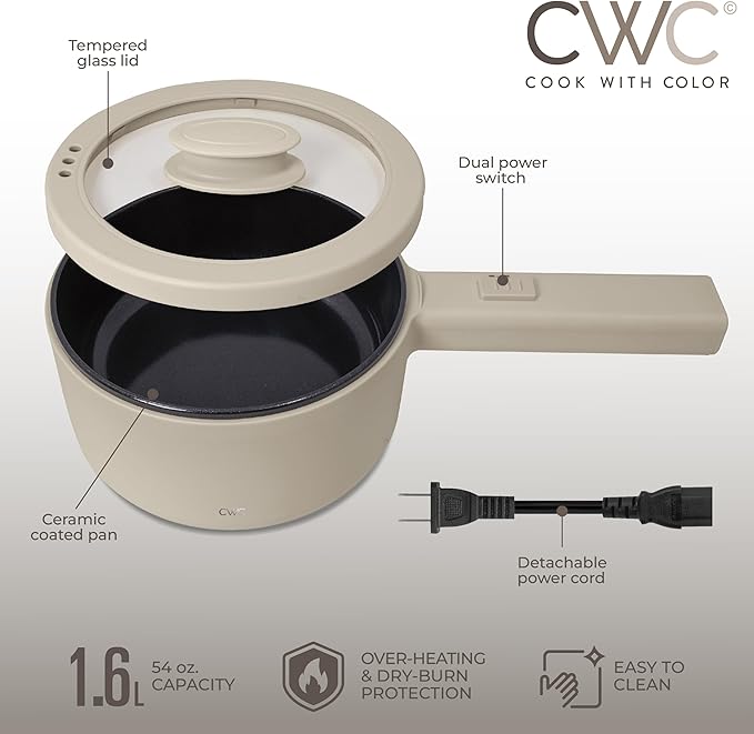 COOK WITH COLOR Electric Hot Pot, 1.6L Mini Cooker, 700W Power, Non-Stick Surface, Thermal Cut-Out Protection, Perfect for Rice, Noodles, Soups, Stews, Dorms, Apartments, and Small Kitchens, Greige