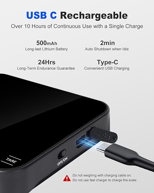 - Long Battery Life: This small coffee scale has a built-in 500mah rechargeable lithium battery, complimentary type-C usb charging cable (you need to prepare your own charging head), and with low battery reminder, when the low voltage icon "LO" appears on the screen, it will auto power-off. It takes 2 hours to full charge, long-lasting battery life of up to 90 days, and continuous use can reach 10 hours