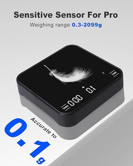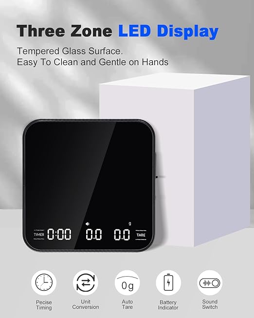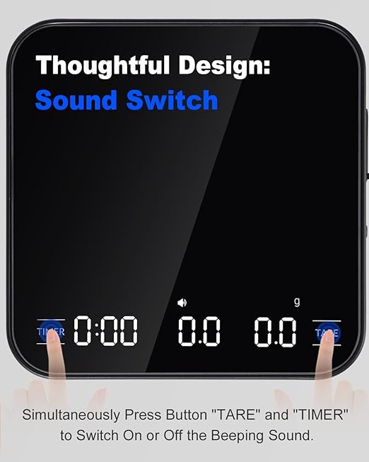 - Mute Funtion & Sleep Mode: Lamido coffee scale has a mute function, allowing you to enjoy a peaceful coffee morning. Tap and hold the TARE and TIMER buttons for 2 seconds to eliminate the beeping sound and immerse yourself in the peaceful brewing process. And also, tap TARE for 2 seconds to enter sleep mode or leave it for 2 minutes with no operation, tap TARE to wake up the scale again or place items weighing over 20 grams