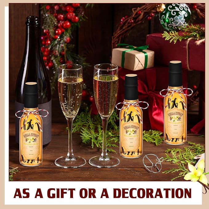 - Dimensions and Materials: elevate your bottle collection with our mini wine bottles for favors; These 3 oz capacity bottles ensure ample storage; Our vanilla essence stickers, made of paper, measure up to 1.38 x 2.05 inches/ 3.5 x 5.2 cm; To wrap it all up, we offer a roll of red and white cotton rope, about 10 meters long with a promise of durability, attractiveness, and resistance against breaking