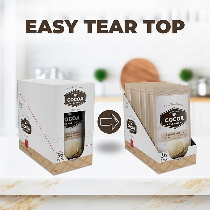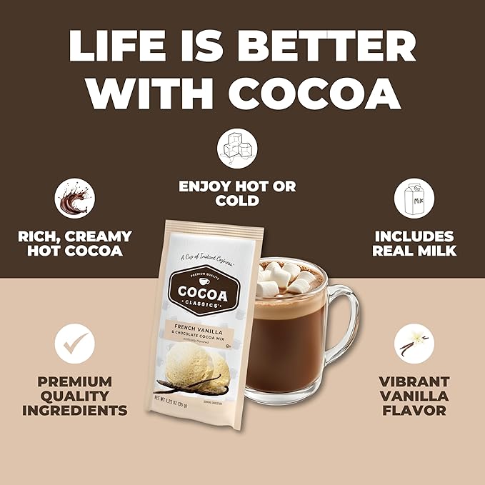 Cocoa Classics French Vanilla Cocoa Mix Hot Chocolate Made with Nonfat Milk Just Add Hot Water Make Hot or Iced Cocoa Gluten Free & Kosher Dairy Friendly 1.25oz Packets (Pack of 36)