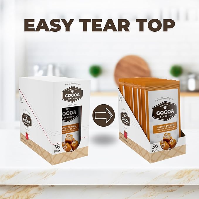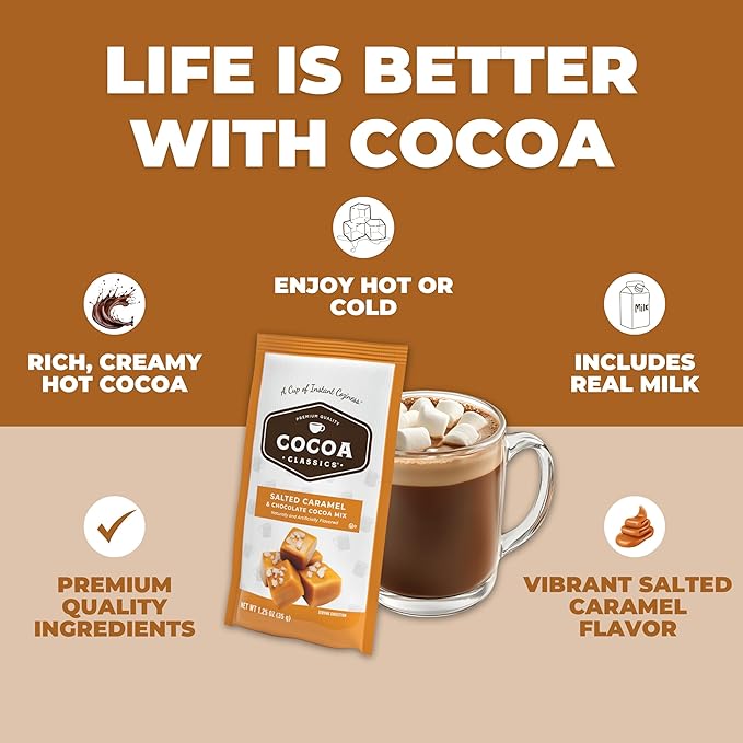 Cocoa Classics Salted Caramel Cocoa Mix, Hot Chocolate, Made with Nonfat Milk, Just Add Hot Water, Make Hot or Iced Cocoa, Gluten Free & Kosher Dairy Friendly, 1.25oz Packets (Pack of 36)