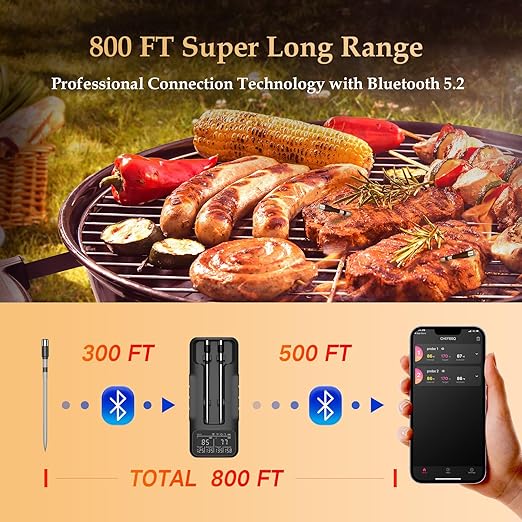 - Farther Accurater: Wireless meat thermometer uses advanced 5.2 Bluetooth technology to monitor food temperature up to 800 feet away, with a timer and temperature chart on the app page, you can monitor the real-time temperature from meters away. Never overcook your meat again!