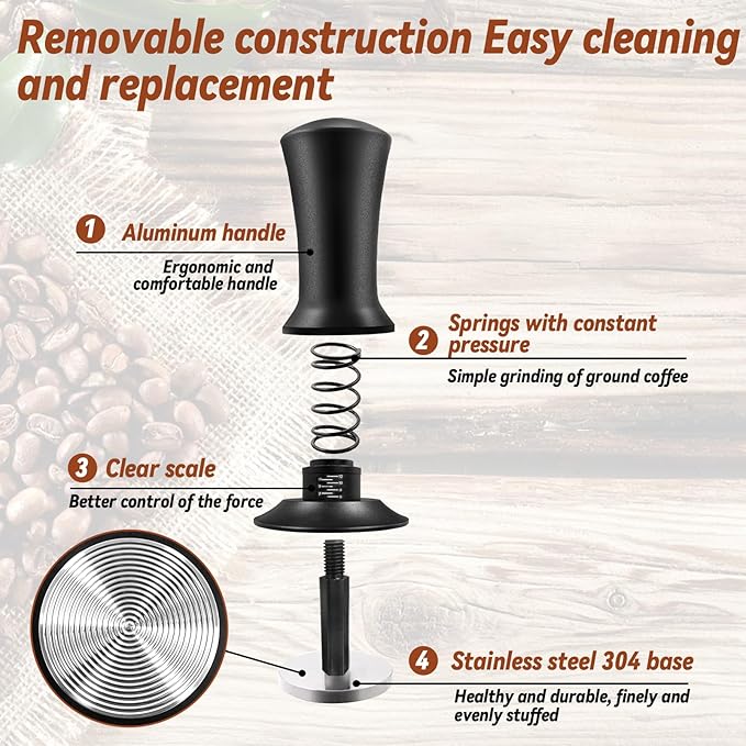 - Coffee Set with Built-in spring and Scale: This set includes a 51mm coffee press, a black six-pin cloth powder dispenser and a black silicone pad. More complete than most sets on the market, no need to buy additional accessories. Our coffee masher features an innovative design with a built-in spring, the pressure will automatically rebound without additional adjustments; the coffee masher is marked with an eye-catching scale for the same mashing result every time.