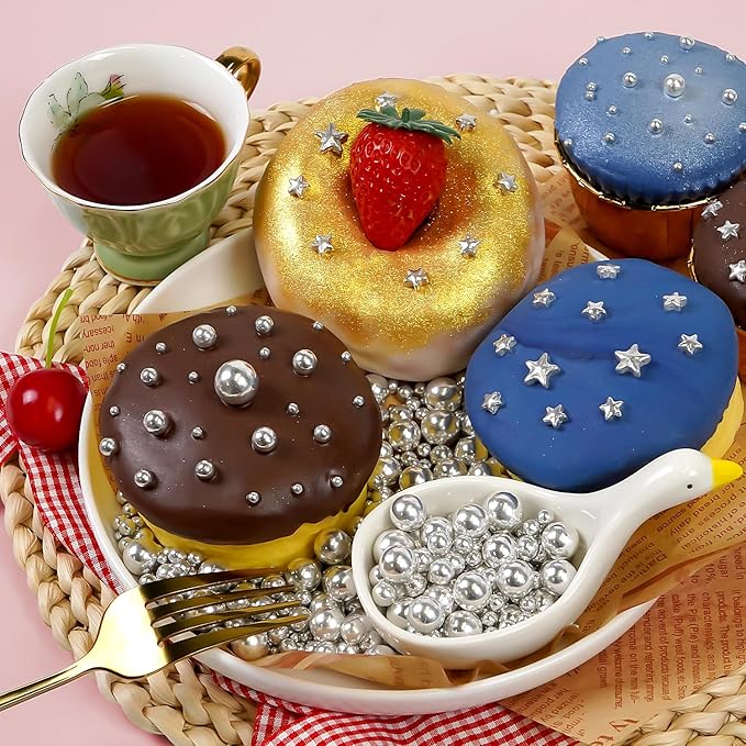 - Great for cake decorating, cookies, cupcake toppers, ice cream, donuts, waffles or milkshake. Silver Pearl Sprinkles make the food more delicate and beautiful. Make your baked goods look more appealing with these silver pearl sprinkles. Metallic Silver Pearl Sprinkles are good for all kinds of festival baking and decorating.