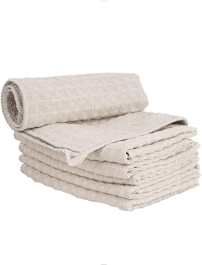 - FAST DRY AND DURABLE: Waffle weave design makes the cloth holds liquids quickly and dry fast, no need to worry about the bad smell. Machine wash with similar colors. Khaki color micro cloth to coordinate with your home and kitchen cleaning.
