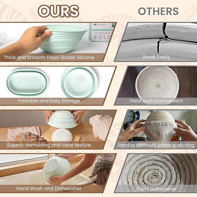 - 【Foldable, Easy to Use, and Easy to Clean】The silicone proofing basket can be folded into a small size for easy storage. It can be hand-washed or placed directly in the dishwasher, saving time and effort. Compact and space-saving, it is an ideal choice for modern kitchens.