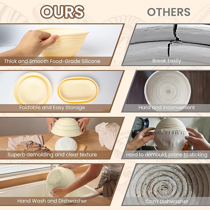 - 【Comprehensive Proofing Tool Set】The set includes a 9.5" round and a 10.4" oval silicone proofing basket, a flour duster, a bread lame with 5 blades and blade protector, 2 breathable cloth covers, a Danish dough whisk, a metal dough scraper, a bowl scraper, and a basting brush. All the necessary tools are here, making every step easy to complete