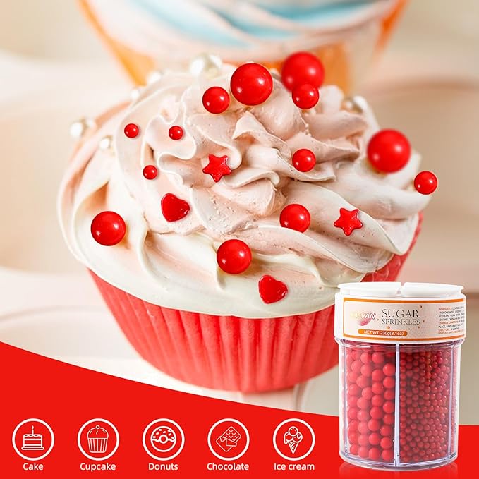 - ✨PACKAGE INCLUDES: 1 edible bottle of Red pearl sugar, 130g/4.58 oz. The main ingredients of sugar pearls are: sugar, beetroot, spirulina, carnauba wax, gluten free, nut free.