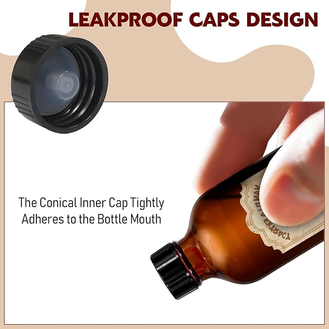 - 【Durable Material】Amber glass bottle made of thickened glass, leakage-proof black lids, and corrosion-resistant silicone tops