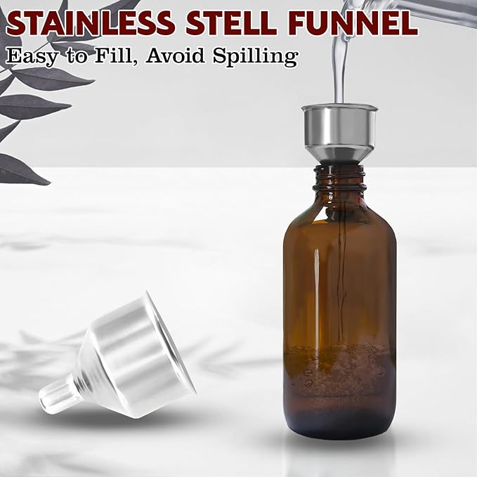- 【Carefully Designed】In order to prevent leakage, we are designed thick black plastic twist lids with soft plastic cones on the inside. The conical inner cap tightly adheres to the bottle mouth to ensure an airtight seal. Small funnels help you do jobs with liquids more effectively