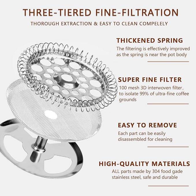 - 2. Sturdier French press: The robust, double-layered body made of stainless steel maintains temperature well. Warm coffee can be kept warm for one to two hours after it is poured out. Preserve your time and energy. The milk just has to be poured in when you require a cup of cappuccino; heating it is no longer necessary.