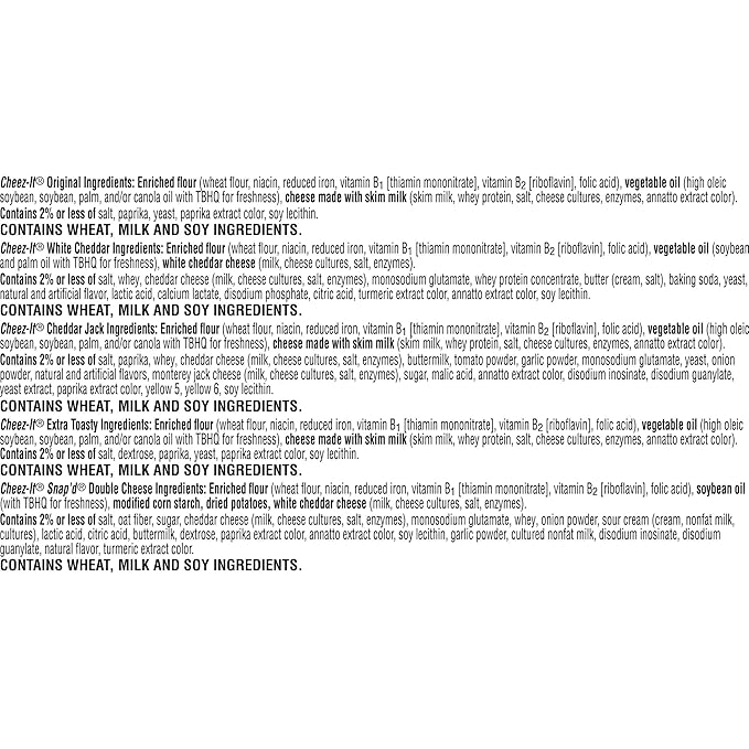 - Light and crispy bite-sized snack crackers; Includes Cheez-It Original, Extra Toasty, Cheddar Jack, White Cheddar and Cheez-It Snap'd Double Cheese
