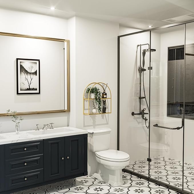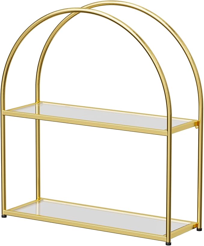 Crofy Gold Arched Frame Wall Shelf, Decorative 2 Tier Bathroom Wall Shelf with Transparent Tempered Glass Shelves and Robust Storage Capacity, 6" D x 17.9" W x 19.18" H