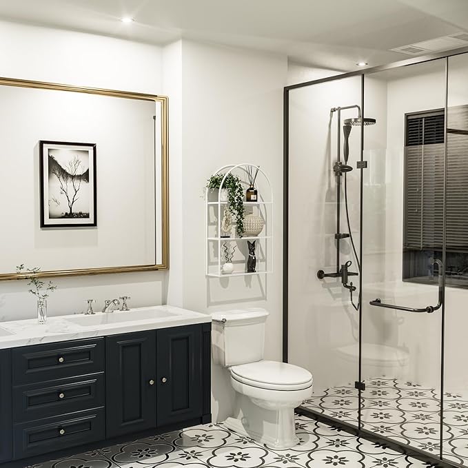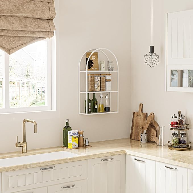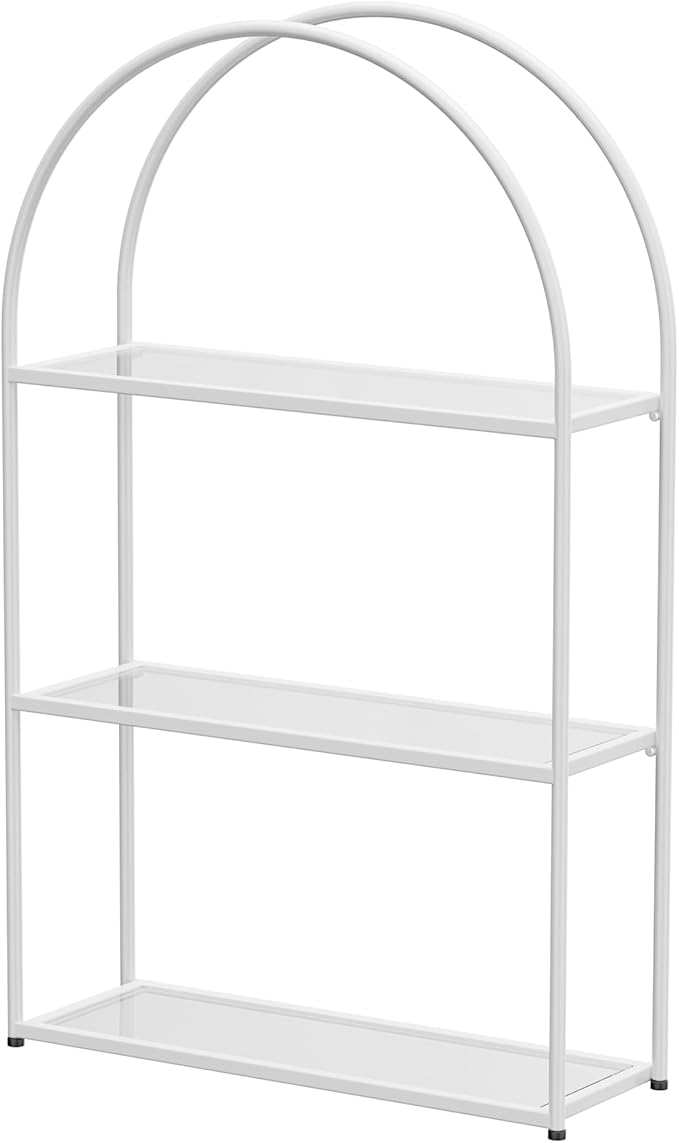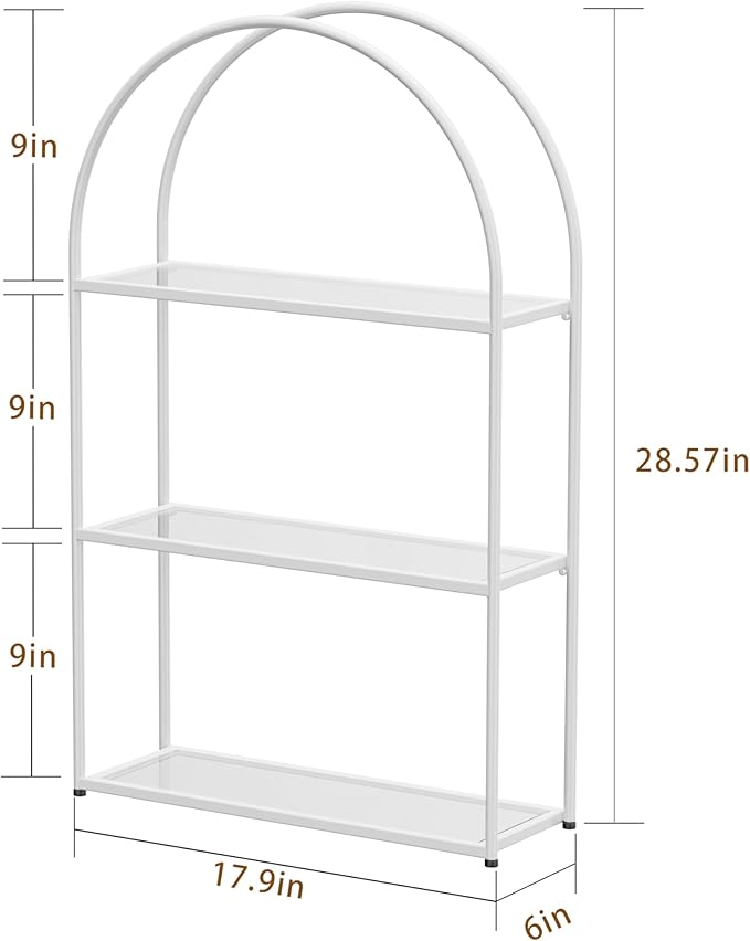 Crofy White Arched Frame Wall Shelf, Decorative 3 Tier Bathroom Wall Shelf with Transparent Tempered Glass Shelves and Robust Storage Capacity, 6" D x 17.9" W x 28.57" H