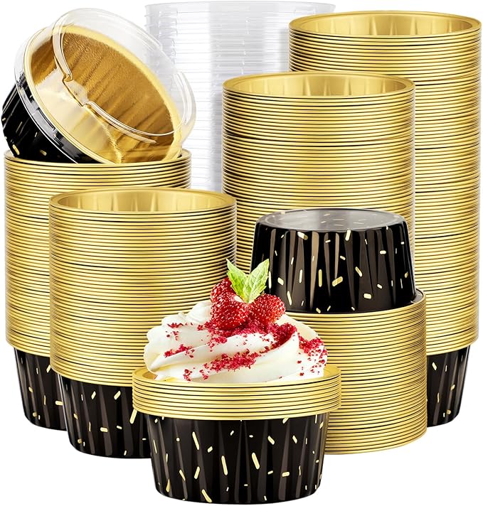 EUSOAR Disposable Ramekins with Lids, 400pcs 5oz Aluminum Foil Cupcake Liners Ramekins Cups for Baking, Dessert Cups Aluminum Cheesecake Pan Creme Brulee Baking Cups for Oven-Black Meteor Shower
