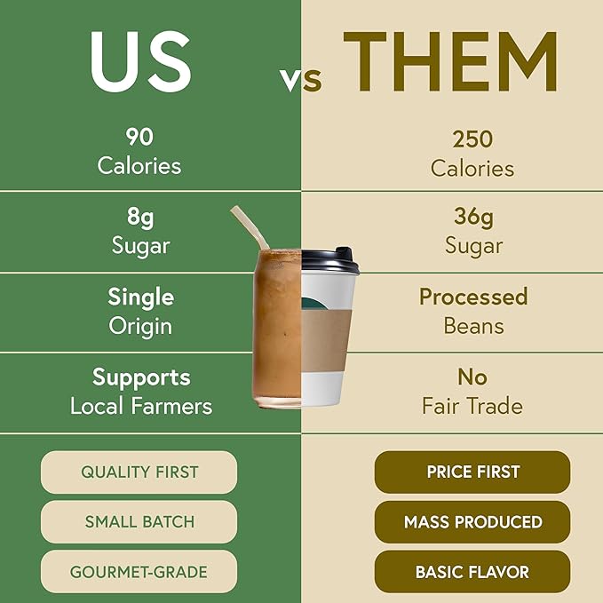 - Clean Ingredients Only – Vegan, dairy-free, gluten-free, and made without seed oils or syrups. Just 90 calories per latte.