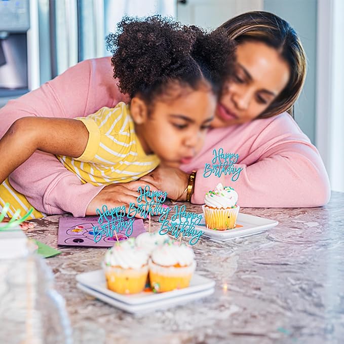 24 PCS Happy Birthday Cupcake Toppers Glitter Picks for Celebrating Anniversary Theme Party Cake Decorations Supplies - Lake Blue
