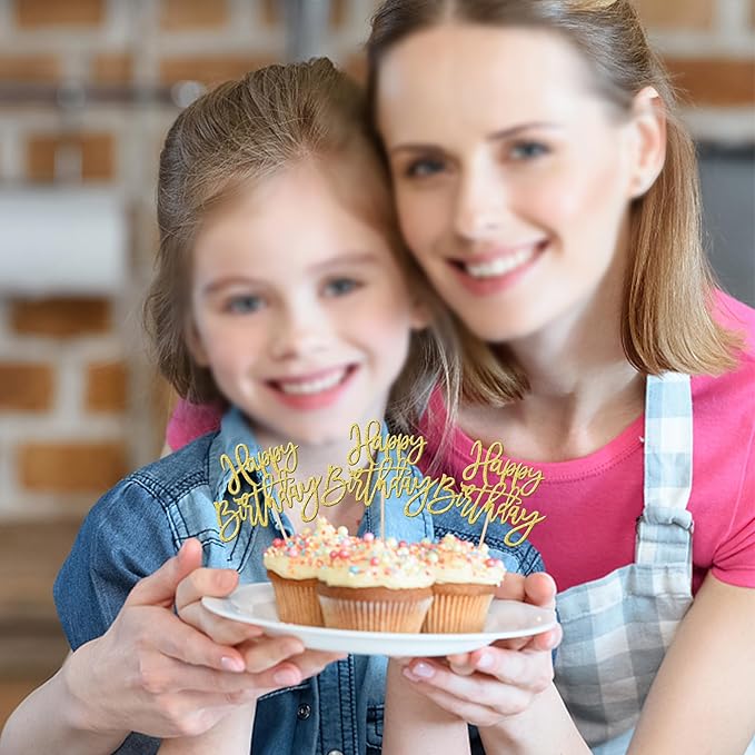 24 PCS Happy Birthday Cupcake Toppers Glitter Picks for Celebrating Anniversary Theme Party Cake Decorations Supplies Gold