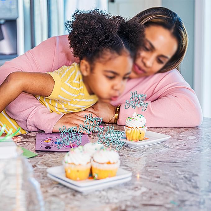 24 PCS Happy Birthday Cupcake Toppers Glitter Picks for Celebrating Anniversary Theme Party Cake Decorations Supplies Light Blue