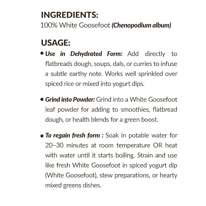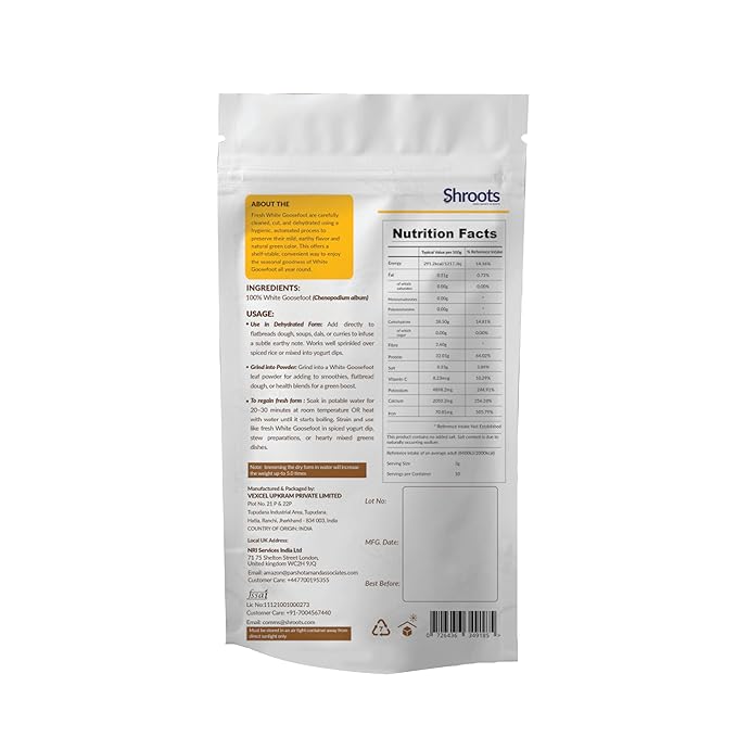 - How Many Serving?: Each 30g (1.06 oz) pack of SHROOTS Dehydrated Bathua Flakes contains approximately 10 servings, with a standard 3g serving size, making it easy to add the right amount to your meals. These ready-to-use flakes are gluten-free, vegan, and contain no added salt or preservatives, offering a pure and healthy choice to enhance your dishes.