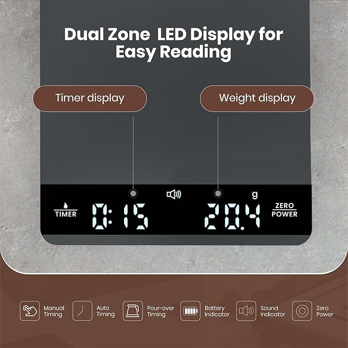 - 【Three Timing Modes & Units Conversion】 The Maestri House Digital Timer Scale offers three units of measurement (g/oz/ml), easily convertible at any time. The scale features three built-in timing modes: manual, automatic espresso, and new automatic pour-over mode. These modes let you time your coffee brewing process with accuracy, ensuring your coffee is always brewed to perfection, tailored to your taste preferences