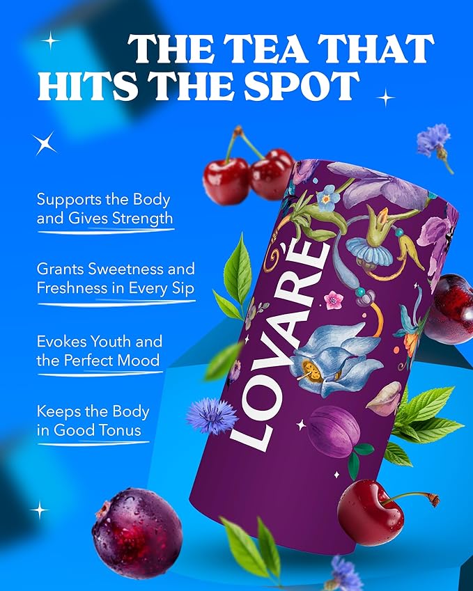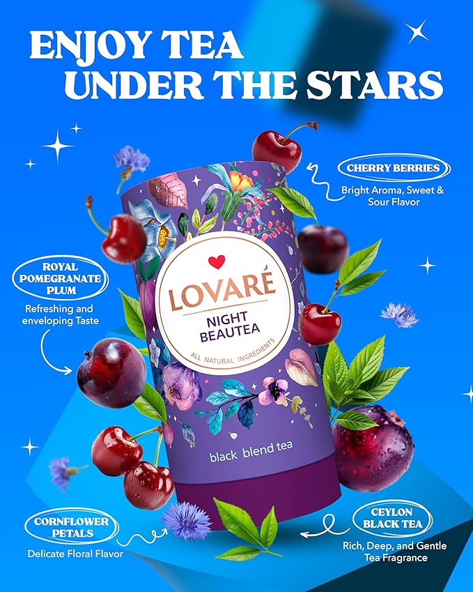 LOVARE Night Beautea Loose Leaf Tea 80 g - Made in Ukraine - Ceylon Black Tea, Cherry Berries, Cornflower Petals, Royal Pomegranate Plum Aroma - Tea Lovers Gift Box with 15 Paper Filters