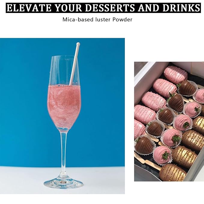 - Easy to Use - Along to use or mix and match to create your own unique metallic colors! This Edible glitter dust for cakes and drinks is simply to apply. Rose gold edible luster dust is formulated to be hyper-pearlescent, for a luminous, spectacular sparkle that takes your desserts, cakes, chocolates and cocktails to more vibrant.