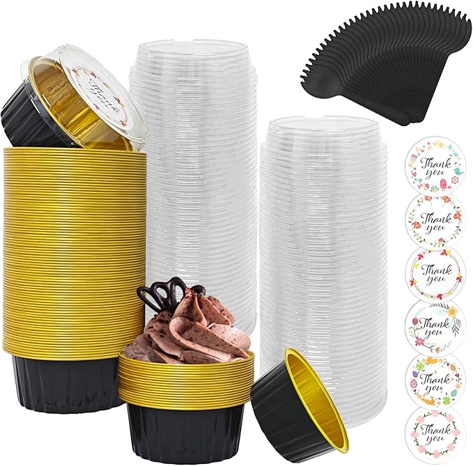 Eunika 100 Pack Aluminum Foil Cupcake Baking Cups w Lids and Spoons for Wedding Party Supplies, 5oz Mini Cake Pans Disposable Ramekins Cups Holder Containers for Birthday Halloween Gifts