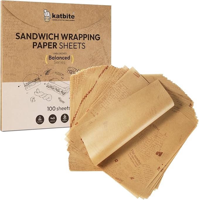 Katbite 100Pcs 12 In Food Wrapping Paper, New Pattern Heavy duty Deli Paper, Greaseproof & Non-stick Parchment Paper, Pre-cut Unbleached Parchment Paper is Perfect for Wrap Bread, Burger and Sandwich