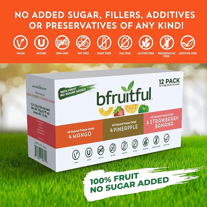 - DRIED FRUIT NO SUGAR ADDED: bfruitful is made with 100% pure goodness. Our fruit snacks are all non-GMO, gluten, grain, egg, dairy and soy free. No added sugar, fillers, additives or preservatives of any kind! Just farm-grown delicious fruit, the way nature intended.