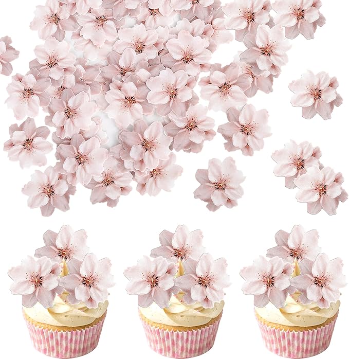 40 Pack Edible Cherry Blossom Cupcake Toppers - Cherry Flowers Cake Toppers Rice Paper Wafer Paper Cake Picks for Bridal Shower Baby Shower Kids Birthday Cake Decorations - Light Pink