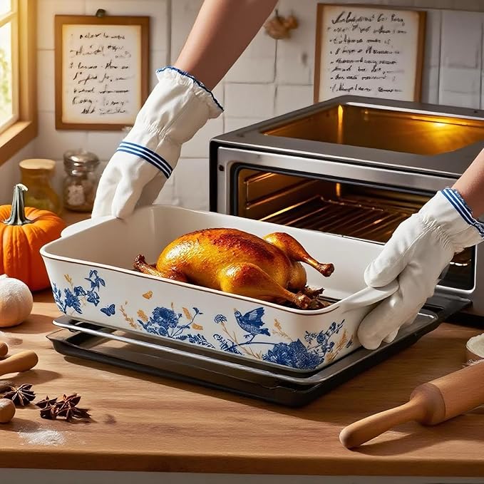 - Easy to clean: Glazed finish resists stains, dishwasher-safe (handwashing recommended for long-lasting beauty). NOTE: The ceramic baking dish set is dishwasher safe but we recommend hand wash for durability and the gold trim over the bakeware is not safe for heating, so please do not put the plates in the microwave.