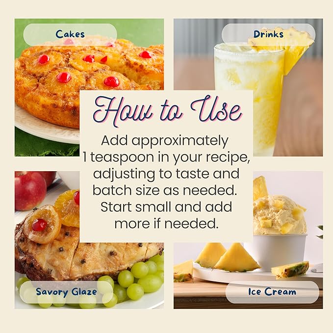 - APPLICATIONS: Just one teaspoon of our pineapple extract can infuse the tropical, sweet taste of pineapple into your baking, desserts, beverages, candy and frostings. It's the perfect pineapple extract for pineapple up-side-down cake, drinks, cupcakes and cookies, marinades and sauces, ice cream, candies and pineapple extract gummies.
