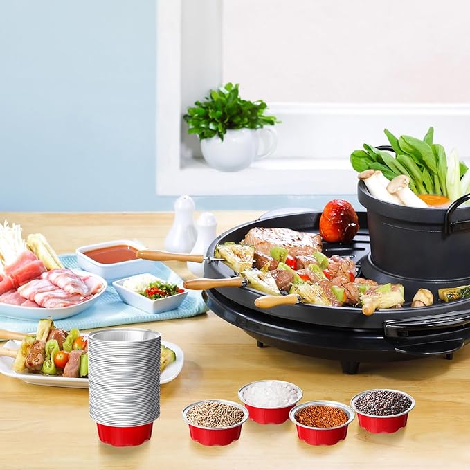 Eaasty 150 Pcs Baking Cups with Lids, 1.6 oz Muffin Cupcake Liners Aluminum Foil Mini Cake Pans Small Disposable Ramekins Flan Containers with Lids for Christmas, Birthday, Various Holiday(Red)