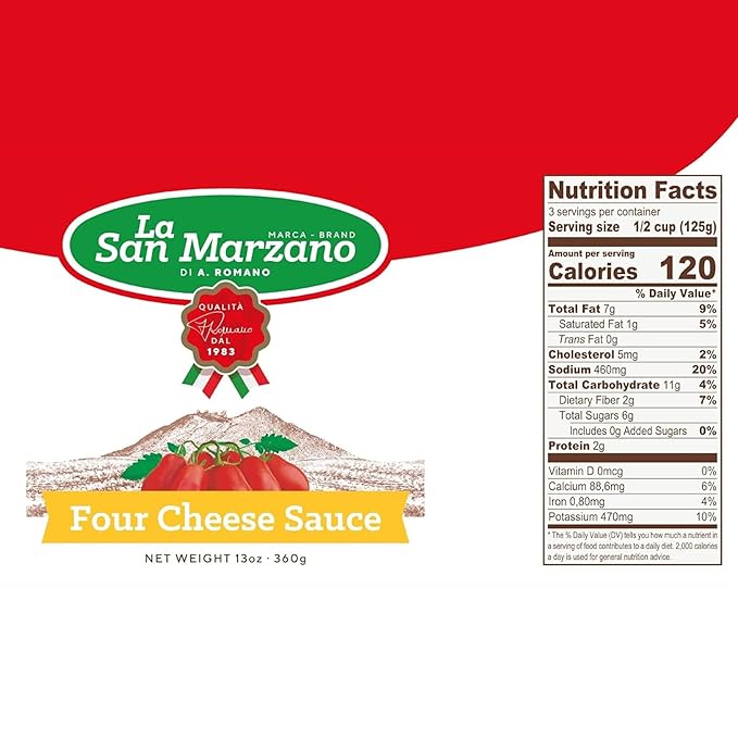 - FOUR CHEESE SAUCE: CREAMY INDULGENCE: Savor the rich goodness of our Four Cheese Sauce. Made with four DOP Italian cheeses: Parmigiano Reggiano aged over 36 months, Pecorino Romano, Trentingrana, and Asiago. We add a touch of carrot purée to balance the flavors. Perfectly balanced for a creamy, savory flavor that enhances any dish. Indulge in a gourmet experience with pure cheesy perfection, straight from Italy
