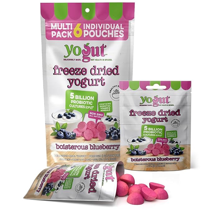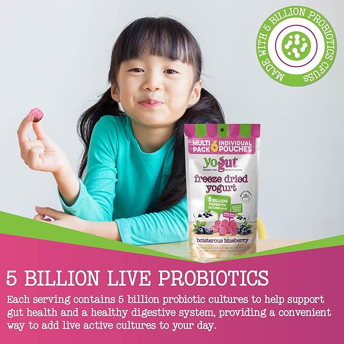 YoGut Freeze Dried Yogurt Snack, Blueberry, 6 Pack, Healthy Snacks for Kids, Toddlers & Adults, Gluten Free, Non GMO, With 5 Billion Live Probiotics, Vitamins & Minerals, Individual Snack Packs