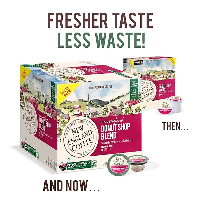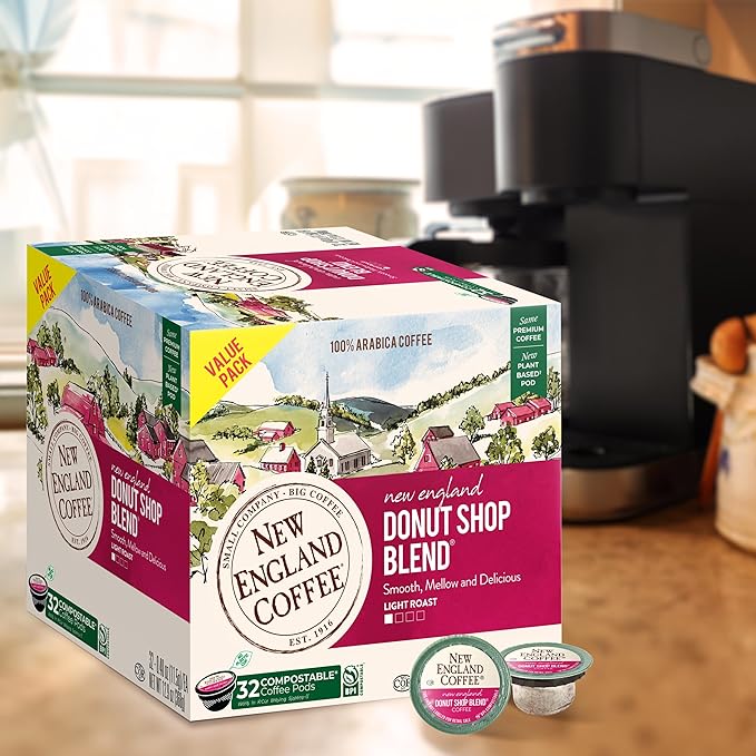 New England Coffee Donut Shop Blend Light Roast Single Serve Pods, 32ct Box (Pack of 1)