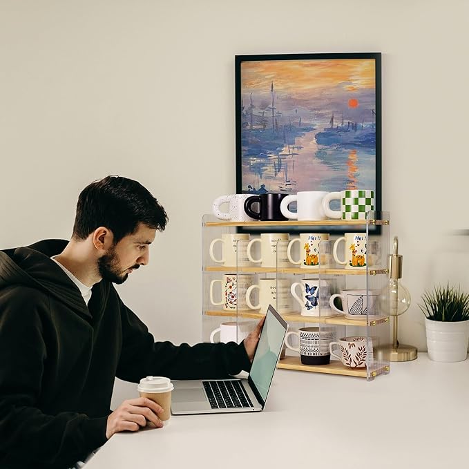 - Stylish Design: Featuring wavy acrylic side panels and a natural wood board. The sturdy construction ensures that it can hold the weight of multiple mugs without wobbling or tipping. this organizer presents an aesthetically pleasing texture, ideal for coffee bar enthusiasts and those who love to decorate their spaces.