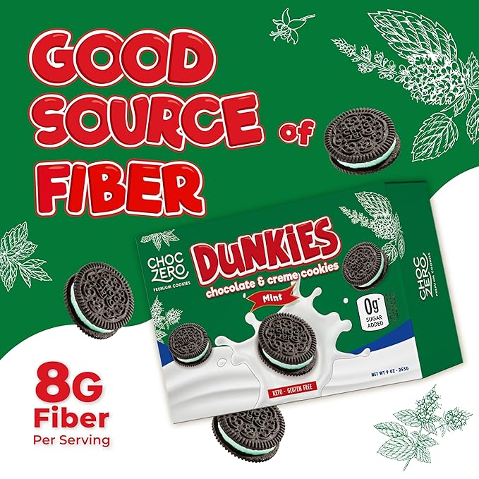 - ChocZero Mint Dunkies — Crispy cocoa sandwich cookies filled with creamy mint-flavored frosting for a refreshing, guilt-free treat.