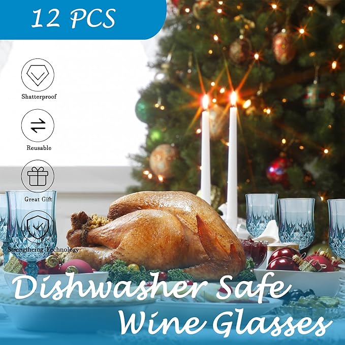 - 🍷🍷🍷【Product Description】 This set includes 12 retro-style dusty blue party plastic wine glasses, providing ample quantity to meet your daily use and replacement needs. The elegant and sophisticated design makes your wedding reception unique