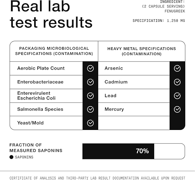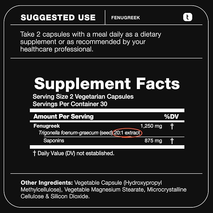 - Ultra High Strength Extract: Each serving delivers a concentrated dose of 1,250mg fenugreek extract, standardized to 70% saponins.