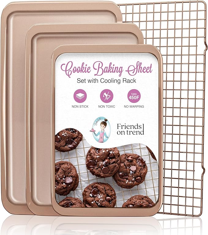 - ๐ก๐ผ๐ป ๐ง๐ผ๐ ๐ถ๐ฐ ๐๐ผ๐ผ๐ธ๐ถ๐ฒ ๐ฆ๐ต๐ฒ๐ฒ๐๐ - keep your baking safe and healthy! These nonstick baking sheets - cookie sheet pans are free from harmful chemicals like PFOA and BPA, featuring a food-safe PTFE coating. With their baking sheets non stick surface, thereโs no need for liners or greasing. Durable and rust-resistant, these small cookie sheets for baking nonstick are designed for everyday use. Prioritize health and convenience with these nonstick cookie sheet pans for baking.