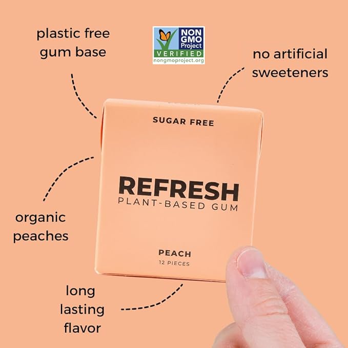 Refresh Gum, Xylitol, Natural, Sugar Free, Long Lasting, Plastic Free, Natural Flavors & Organic Ingredients, Plant-Based, Low Calorie, Non GMO, Gluten Free, Vegan, Peach Flavor, 12 Pieces, 12 Pack