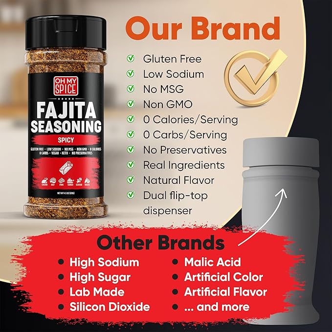 - 🇺🇸 MADE IN THE USA – PREMIUM SPICE BLEND FOR AUTHENTIC TASTE: Proudly made in the USA, our spicy fajita seasoning mix is a chef-approved blend of premium Mexican spices. Whether you’re cooking fajita steak, grilled chicken, shrimp, or vegetarian dishes, this spice mix guarantees restaurant-quality flavor at home. Perfect for family meals, meal prepping, and BBQ nights with authentic, bold seasoning.