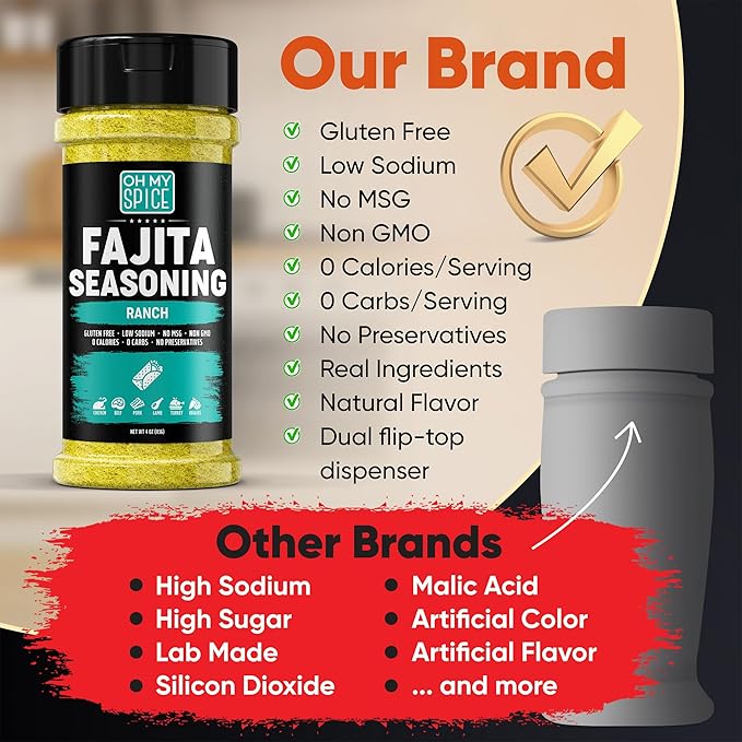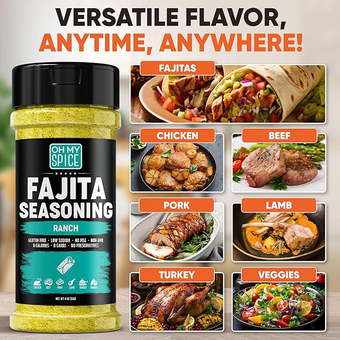 - ✅ GLUTEN FREE, LOW SODIUM & NO MSG – Enjoy full flavor without the guilt! This ranch fajita seasoning is made with clean, natural ingredients and contains no preservatives, no MSG, and no artificial flavors. With 0 calories, 0 carbs, and low sodium, it’s a great choice for gluten-free and health-conscious diets while delivering bold, cheesy ranch goodness in every bite.