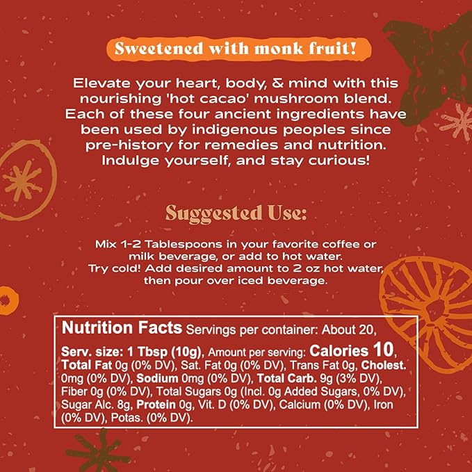 - All Fair-Trade, Organic, & Wildcrafted Ingredients -- Our rich blend of fair trade & organic Cacaos, blended with organic Monk Fruit, and US wildcrafted Chaga mushroom extract powder, are all small-batch blended in Seattle to ensure every cup is top-shelf delicious.