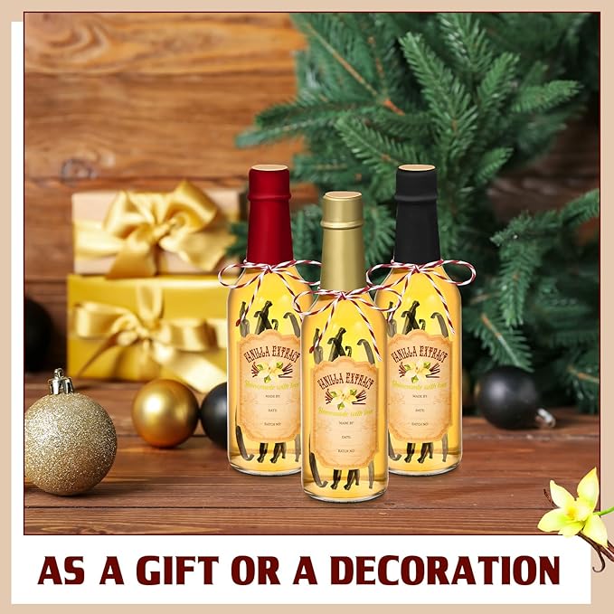 - Dimensions and Materials: elevate your bottle collection with our mini wine bottles for favors; These 8.5 oz capacity bottles ensure ample storage; Our vanilla essence stickers, made of paper, measure up to 1.69 x 2.48 inches/ 4.3 x 6.3 cm; To wrap it all up, we offer a roll of red and white cotton rope, about 10 meters long with a promise of durability, attractiveness, and resistance against breaking