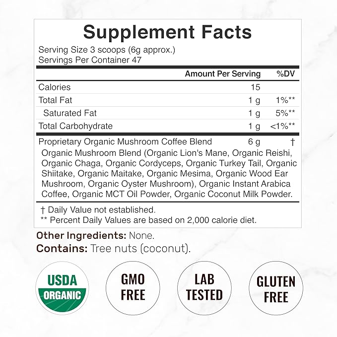 - Dosage & Servings – 10oz supply contains approximately 47 servings, 3 scoops per serving, 6,000mg proprietary blend with organic Arabica coffee and mushrooms including Lion’s Mane, Reishi, Turkey Tail, Chaga, Cordyceps, Maitake, Shiitake, Mesima, Oyster, and Wood Ear.