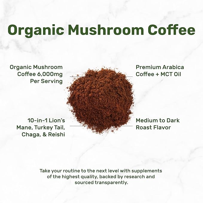 - Special Features – A revitalizing organic mushroom coffee blend, 10 active mushrooms and premium arabica coffee with MCT oil, fresh sourced adaptogenic complex, no fillers or additives for a clean and focused brew.